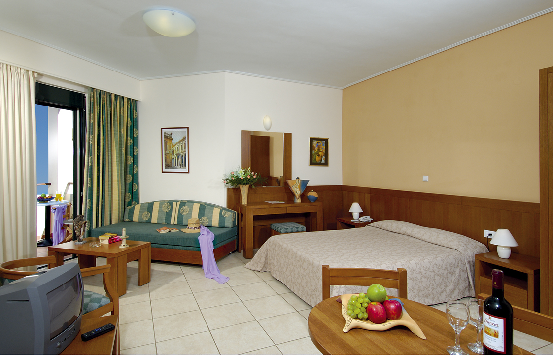 Családi szoba: 3 felnőtt vagy 2 felnőtt + 2-3 gyermek részére, 1 légterű nappali/hálószoba, 2 ágyas hálórész és szeparálható nappali 2 kanapéággyal, egyénileg szabályozható légkondicionáló, műholdas televízió, telefon, széf (térítés ellenében), hűtôszekrény/minibár, internet csatlakozó, fürdôszoba, hajszárító, kertre néző balkon vagy terasz.