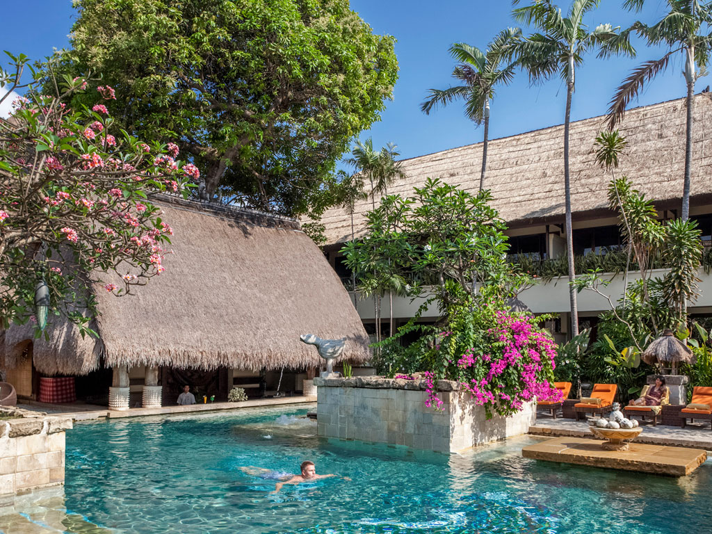 Fekvése: a 4 csillagos szálloda közvetlenül az aranyhomokos tengerparton fekszik, Nusa Dua üdülőhelyen, gyönyörű, trópusi kertben helyezkedik el. A hotel belső kialakításában trópusi fából készült bútorok, meleg színek a természet hatását tükrözi.