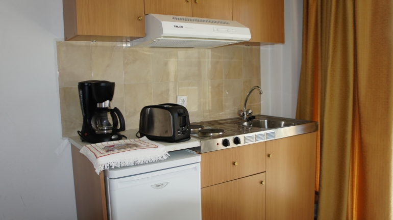 2-3-4 fős stúdió: 1 légterű, modern, kellemesen berendezett, nappali/hálószoba, jól felszerelt konyhasarok, páraelszívó, vízforraló, hűtőszekrény, légkondicionáló (felár ellenében), ingyenes Wifi internetezési lehetőség, fürdőszoba, hajszárító, balkon vagy terasz.