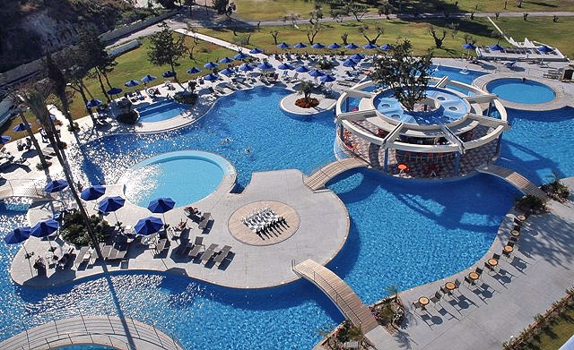 Fekvése: az 5 csillagos luxusszálloda komplexum a „Kék Zászlóval" kitüntetett kavicsos tengerparttól egy rövid sétára fekszik, Ixia üdülőhelyen, egy gyönyörű mediterrán kertben helyezkedik el. A strandot egy aluljárón át lehet megközelíteni. A lépcsőzetesen kialakított hotelból gyönyörű kilátás nyílik a tengerre. Rodosz város központja 4 km, a repülőtér 15 km távolságra.
